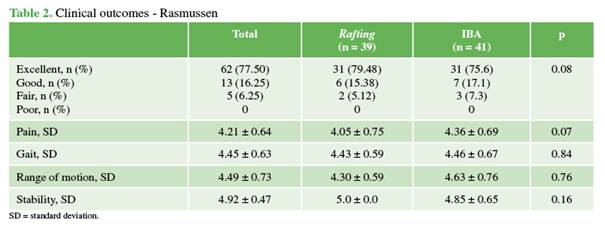 Rasmussen score was excellent or very good in 96.25% of patients, again with no