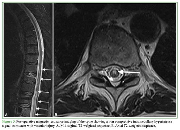 cemento, la resonancia magnética confirmó una isquemia medular desde T9 a L4.