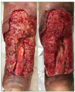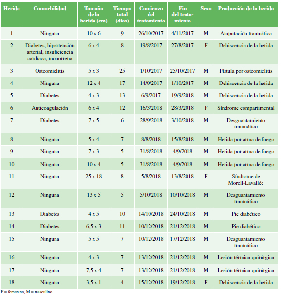 Materiales y Métodos: Se incluyeron 18 heridas de 16 pacientes que cumplían con los criterios de inclusión. Se realizaron curaciones ambulatorias con gasas embebidas en digluconato de clorhexidina al 20%, cada 48-72 h, hasta lograr la adecuada granulación de tejido y se tomaron fotografías de la evolución clínica de las heridas.