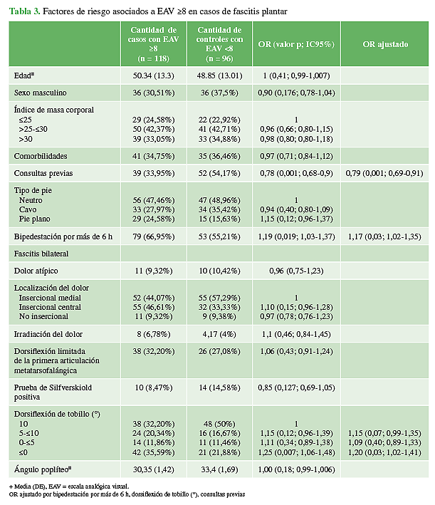 Resultados: Se incluyó a 214 pacientes. El 64% eran hombres (118 pacientes), la media de la edad era de 49.67 años (DE 13.16) y el índice de masa corporal promedio, de 28,53 (DE 5,18). En el análisis multivariado, se observó que el riesgo de un puntaje ≥8 en la escala de dolor aumentó cuando el paciente refirió estar de pie por más de 6 h (OR 1,17; p = 0,03; IC95% 1,02-1,35). El riesgo de un puntaje >8 fue mayor cuando el grado de dorsiflexión del tobillo fue <0° (OR 1,20; p = 0,03; IC95% 1,02-1,41).