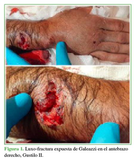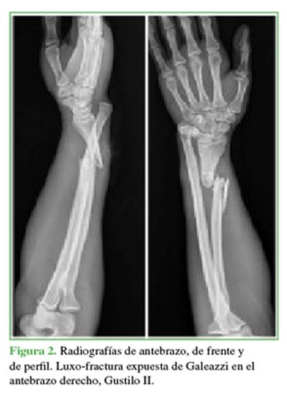 una luxo-fractura expuesta de Galeazzi en el antebrazo derecho, Gustilo II