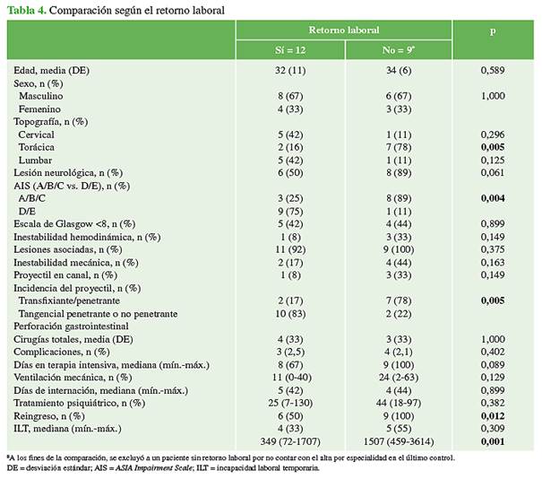 vertebrales por proyectil de arma de fuego según el retorno laboral