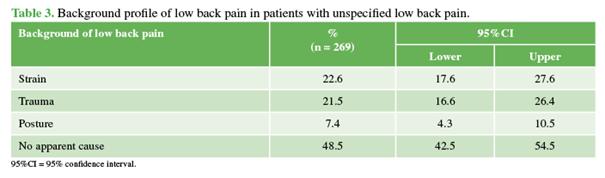 CI: 52.6–64.4). In 22.6% of cases (95% CI: 17.6–27.6), the onset of low back