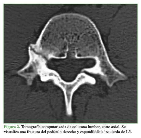 una fractura del pedículo derecho de L5 y espondilólisis contralateral. La
