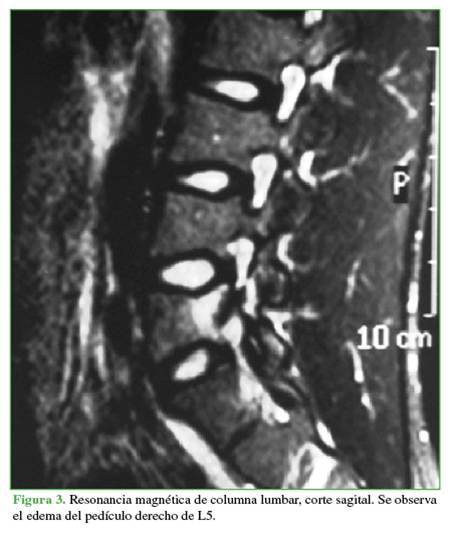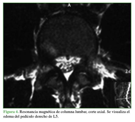 En la resonancia magnética, se visualizó un edema en dicho pedículo lumbar (Figuras 3 y 4).