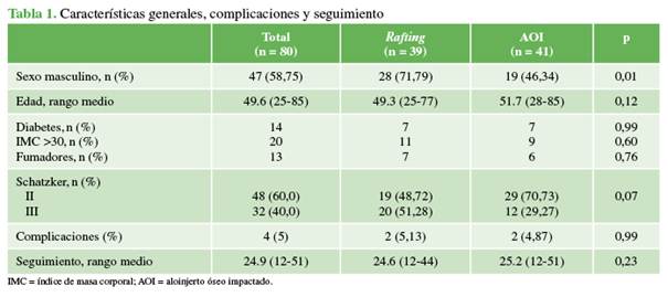 tenía 80 pacientes, 39 tratados con técnica de rafting y 41, con injerto óseo impactado. Dos pacientes del grupo