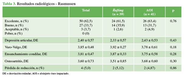mm) y los resultados clínicos y radiológicos mediante las escalas de Rasmussen