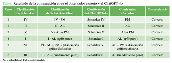 ChatGPT-4o clasificó correctamente los 6 casos de fractura de platillo tibial