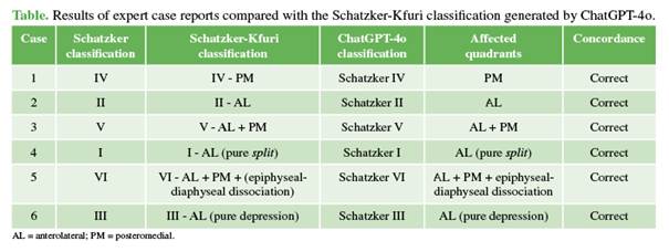 ChatGPT-4o model correctly classified all six cases of tibial plateau fractures